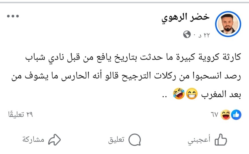 قال الصحفي خضر الرهوي إن الساحة الرياضية في يافع شهدت حادثة غير مسبوقة وصفها بـ"الكارثة الكروية"، بعد انسحاب نادي شباب رصد أثناء ركلات الترجيح في إحدى المباريات.
