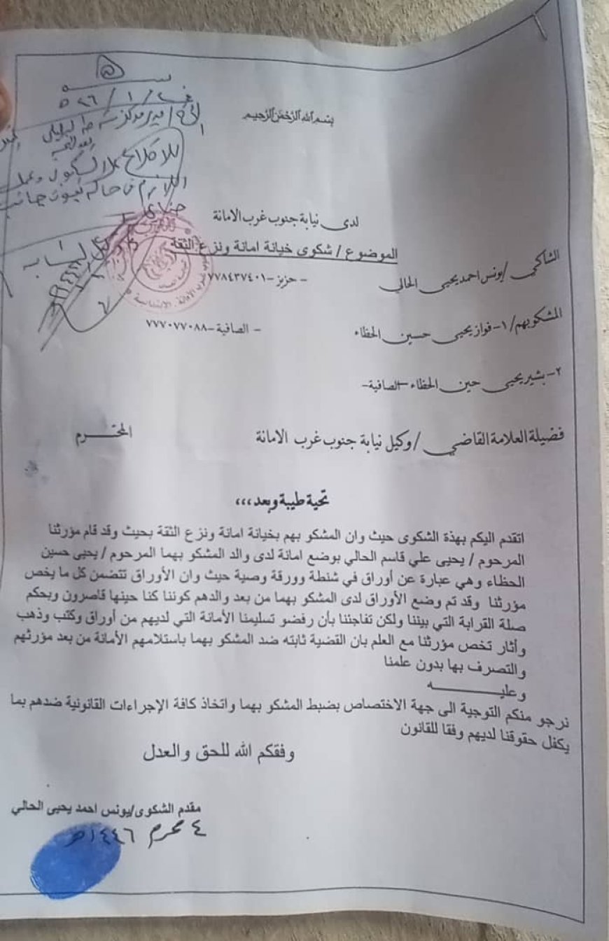 وبحسب روايتهم، فإن والدهم الراحل كان قد أودع جميع ممتلكاته وأوراقه الثبوتية لدى التاجر يحيى الحظاء بصفته وصياً عليهم، غير أن الأخير توفي لاحقاً دون أن يسلم الحقوق أو يبلغ ورثته بوجود الأمانة.
