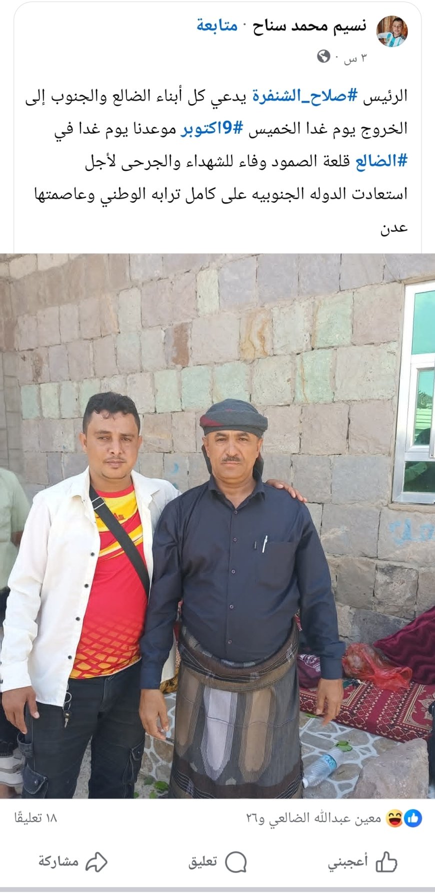 دعا الرئيس صلاح الشنفرة، في تصريح نقله الناشط نسيم محمد سناح، جميع أبناء الضالع والجنوب إلى الخروج يوم الخميس الموافق 9 أكتوبر 2025م، في مدينة الضالع – قلعة الصمود، للتعبير عن الوفاء للشهداء والجرحى، والتأكيد على الثبات في مسيرة استعادة الدولة الجنوبية على كامل ترابها الوطني وعاصمتها عدن.
