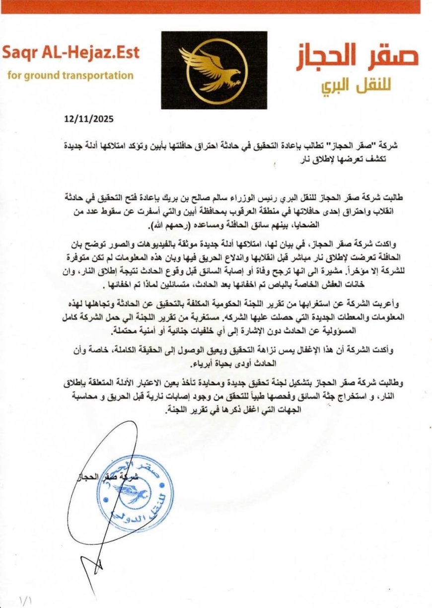 عاجل: شركة "صقر الحجاز" تطالب بإعادة التحقيق في حادثة احتراق حافلتها بأبين وتؤكد امتلاكها أدلة جديدة تكشف تعرضها لإطلاق نار(وثيقة)