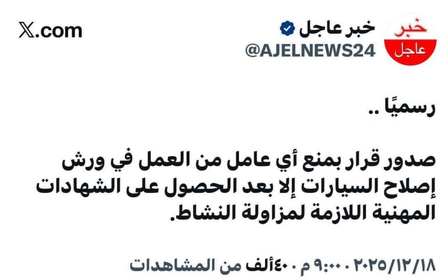 وأكد مختصون أن هذا التوجه يأتي ضمن خطط تطوير القطاعات الفنية والمهنية، والحد من الممارسات غير النظامية، وضمان امتلاك العاملين للمهارات والمعرفة الفنية وفق معايير معتمدة، بما ينعكس إيجابًا على المستهلكين وسلامة المركبات.