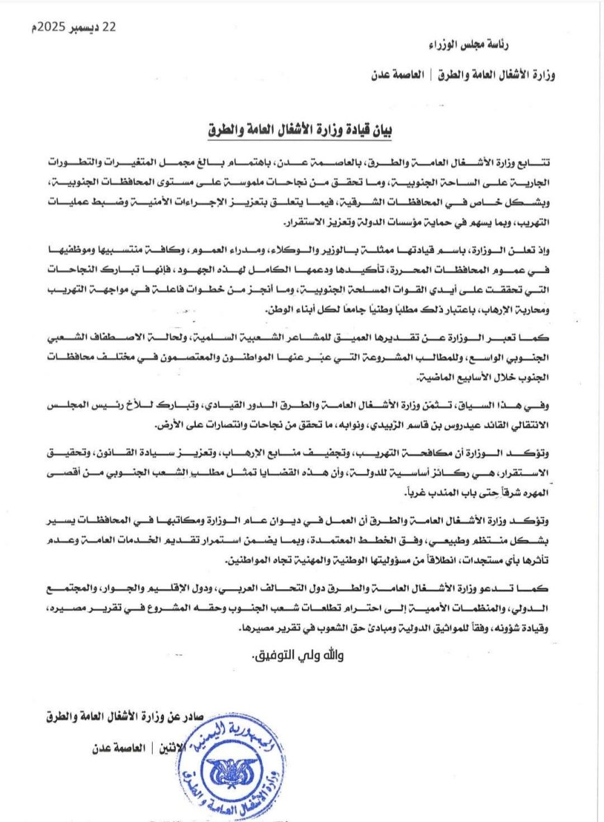 عاجل:وزارة الأشغال العامة والطرق تعلن تأييدها لخطوات المجلس الانتقالي لإعلان دولة الجنوب العربي