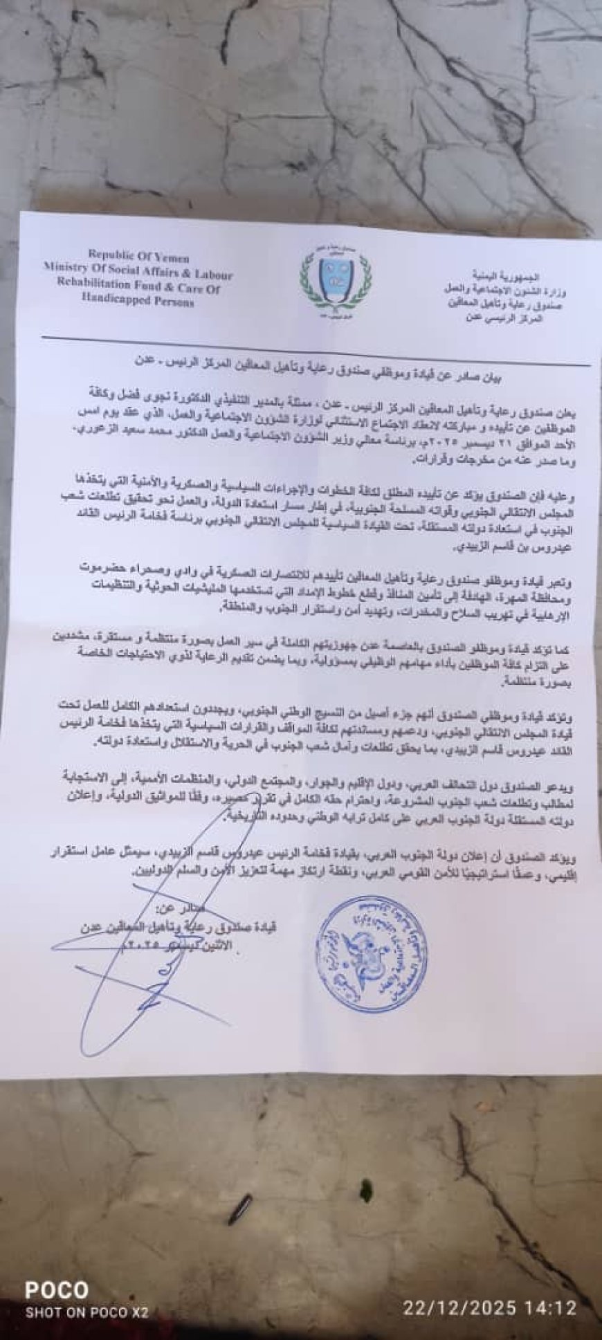 وقال صندوق رعاية وتأهيل المعاقين في بيان صادر عنه اليوم الاثنين الموافق 22 ديسمبر 2025م، أننا نؤكد تأييده المطلق لكافة الخطوات والإجراءات السياسية والعسكرية والأمنية التي يتخذها المجلس الانتقالي الجنوبي وقواته المسلحة الجنوبية، في إطار مسار استعادة الدولة، والعمل نحو تحقيق تطلعات شعب الجنوب في استعادة دولته المستقلة، تحت القيادة السياسية للمجلس الانتقالي الجنوبي برئاسة فخامة الرئيس القائد عيدروس بن قاسم الزبيدي.