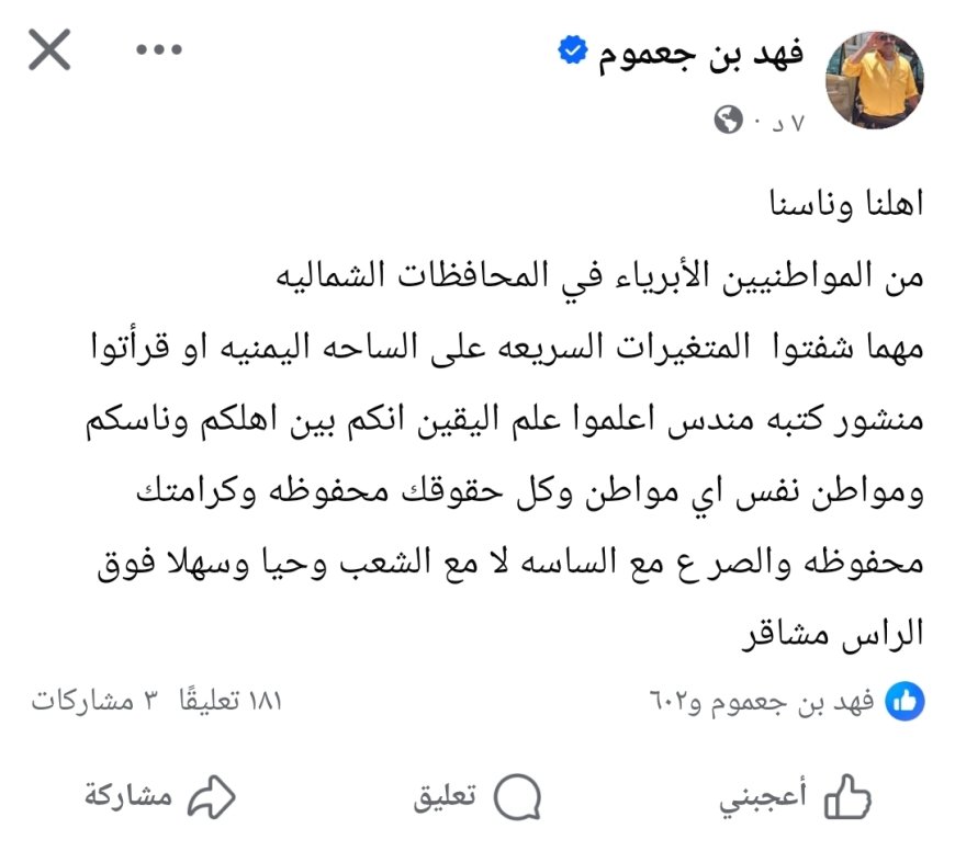 الشاعر فهد بن جعموم يوجّه رسالة طمأنة لأبناء المحافظات الشمالية: أنتم بين أهلكم وحقوقكم مصونة