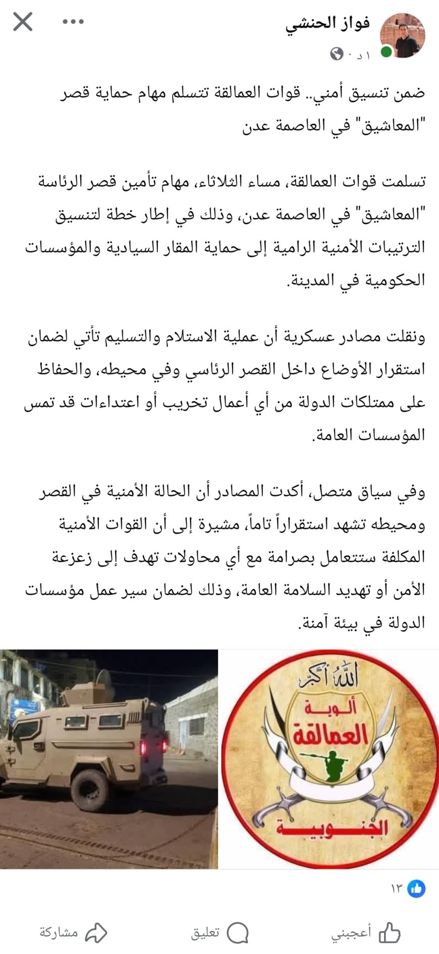 تسلمت قوات العمالقة، مساء الثلاثاء، مهام تأمين قصر الرئاسة "المعاشيق" في العاصمة عدن، وذلك في إطار خطة لتنسيق الترتيبات الأمنية الرامية إلى حماية المقار السيادية والمؤسسات الحكومية في المدينة.
