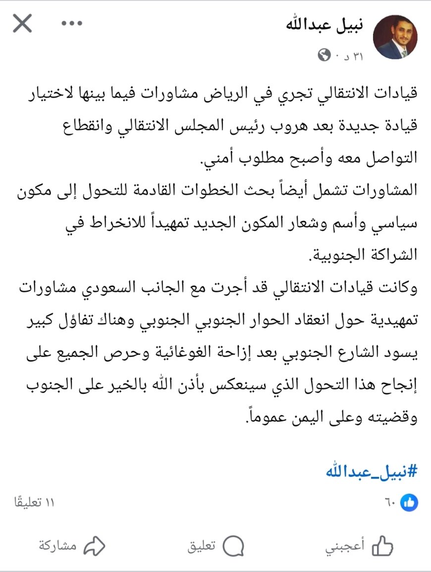 قال الصحفي نبيل عبدالله العسعوس إن قيادات في المجلس الانتقالي تجري حاليًا مشاورات مكثفة في العاصمة السعودية الرياض لاختيار قيادة جديدة، وذلك في ظل ما وصفه بـ«هروب رئيس المجلس وانقطاع التواصل معه»، مشيرًا إلى أنه أصبح مطلوبًا أمنيًا بحسب تعبيره.