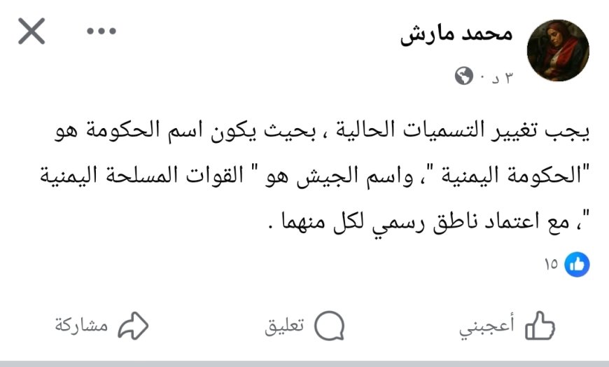 وقال مارش في منشور على حائطه بالفيسبوك رصده محرر موقع منبر الأخبار إن من المهم أن يُعتمد اسم “الحكومة اليمنية” كتسمية رسمية للحكومة، واسم “القوات المسلحة اليمنية” للجيش، مشددًا على أن هذه الخطوة تمثل ضرورة وطنية وليست شكلية.