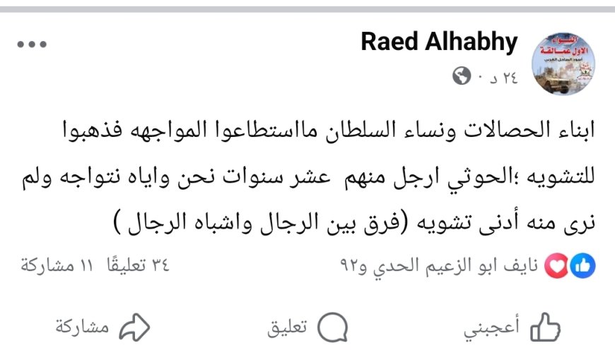 وأوضح الحبهي، في منشور على حسابه الرسمي بموقع فيسبوك، رصده محرر موقع منبر الأخبار، أن من وصفهم بـ«أبناء الحصالات ونساء السلطان» لم يستطيعوا المواجهة فلجأوا إلى التشويه، مضيفًا: “الحوثي أرجل منهم، عشر سنوات ونحن نواجهه في الميدان، ولم نرَ منه أدنى تشويه، والفرق واضح بين الرجال وأشباه الرجال”.