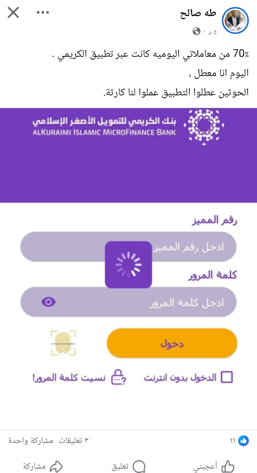 وأوضح صالح في منشور على حائطه بالفيسبوك رصده محرر موقع منبر الأخبار أن تعطيل التطبيق أدى إلى تعطّل مصالحه بشكل كامل، مضيفًا: «اليوم أنا معطّل، ما حدث كارثة حقيقية علينا كمواطنين»، محمّلًا جماعة الحوثيين مسؤولية إيقاف الخدمة وما ترتب عليه من آثار سلبية مباشرة على حياة الناس اليومية.