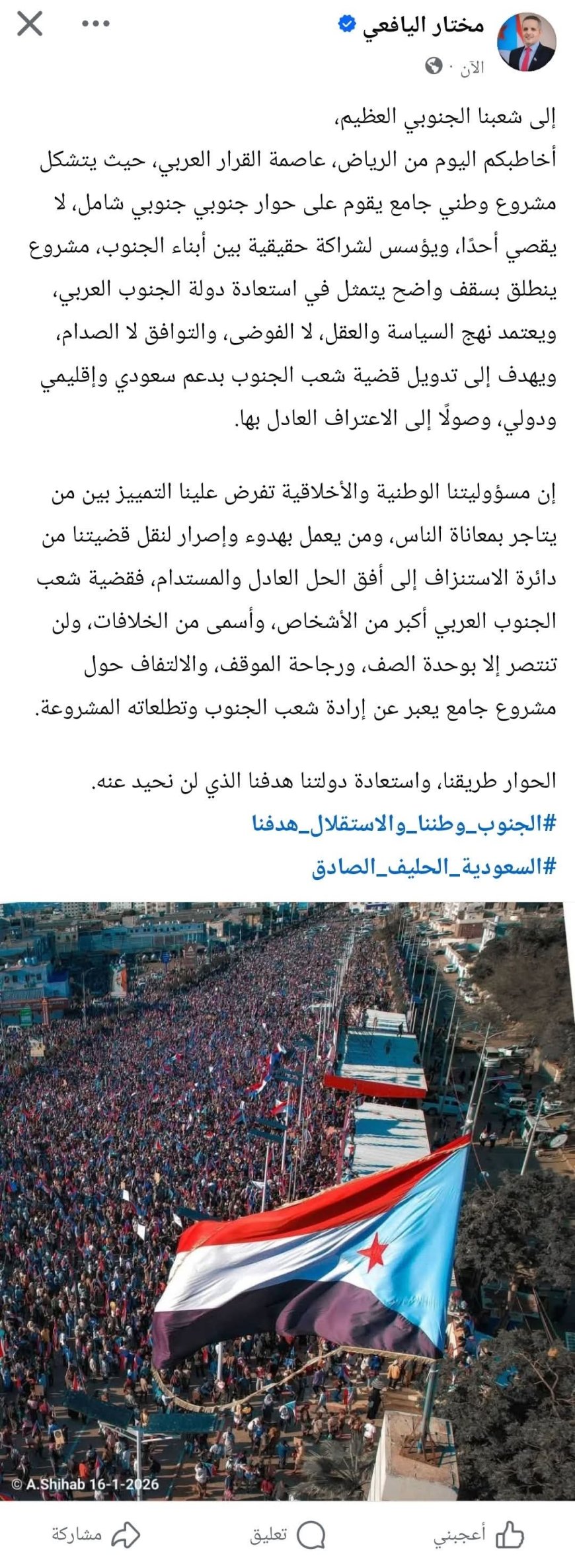 مختار اليافعي من الرياض: حوار جنوبي شامل لاستعادة الدولة وتدويل قضية الجنوب