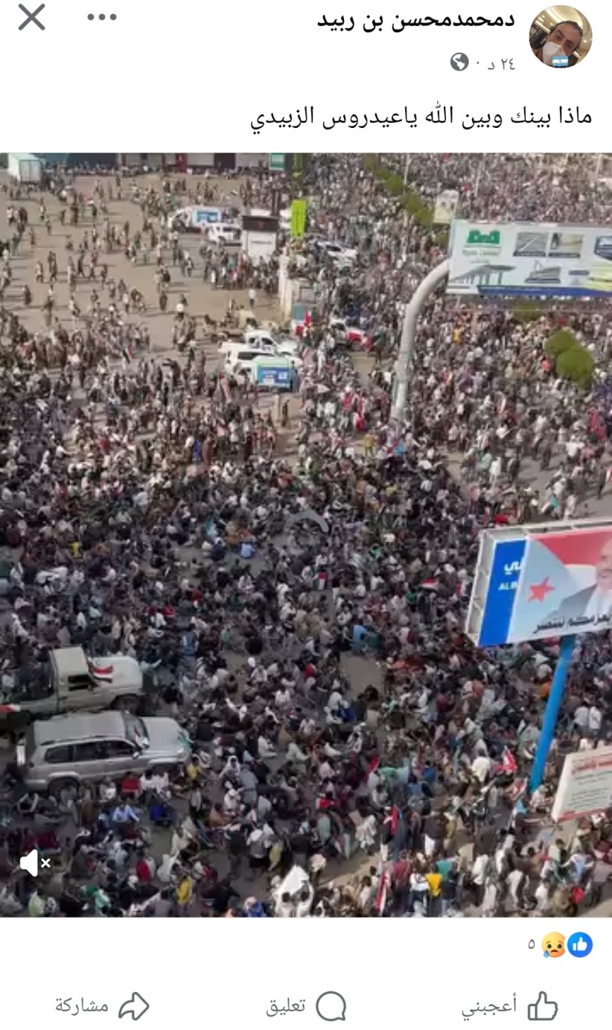 وقال ربيد، في تعليق له على الفعالية، مخاطباً رئيس المجلس الانتقالي الجنوبي عيدروس الزبيدي:«ماذا بينك وبين الله يا عيدروس الزبيدي؟» في إشارة إلى الزخم الجماهيري الواسع الذي شهدته الساحة، والذي جاء استجابةً للدعوة التي أطلقها الزبيدي للاحتشاد.