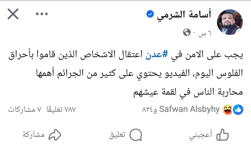 قال وكيل وزارة الإعلام، أسامة الشرمي في منشور على حائطه بالفيسبوك رصده محرر موقع منبر الأخبار إن على الأجهزة الأمنية في العاصمة المؤقتة عدن سرعة التحرك واعتقال الأشخاص الذين أقدموا على إحراق الأموال اليوم، مؤكدًا أن ما جرى يمثل سلوكًا إجراميًا خطيرًا يستوجب المحاسبة.