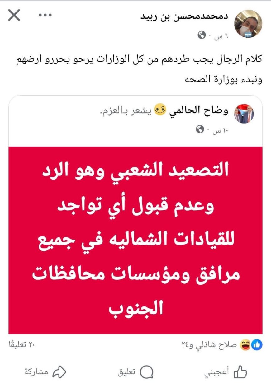 وجاء ذلك في منشور للدكتور ربيد على صفحته الرسمية بموقع فيسبوك، رصده محرر موقع منبر الأخبار، دعا فيه إلى اتخاذ موقف حازم وعدم القبول باستمرار وجود تلك القيادات في مؤسسات الدولة بالجنوب.