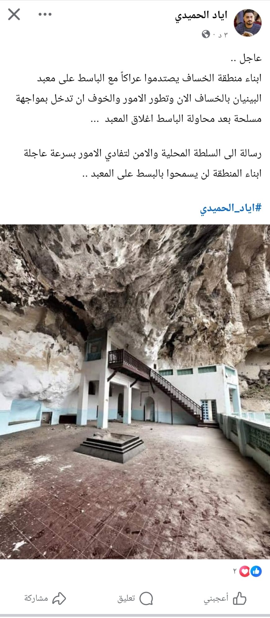 وأوضح الحميدي، في منشور عاجل رصده محرر موقع منبر الأخبار أن أبناء المنطقة عبّروا عن رفضهم القاطع لأي محاولات بسط أو اعتداء على المعبد، مؤكدين أنهم لن يسمحوا بالمساس به أو إغلاقه تحت أي ذريعة.