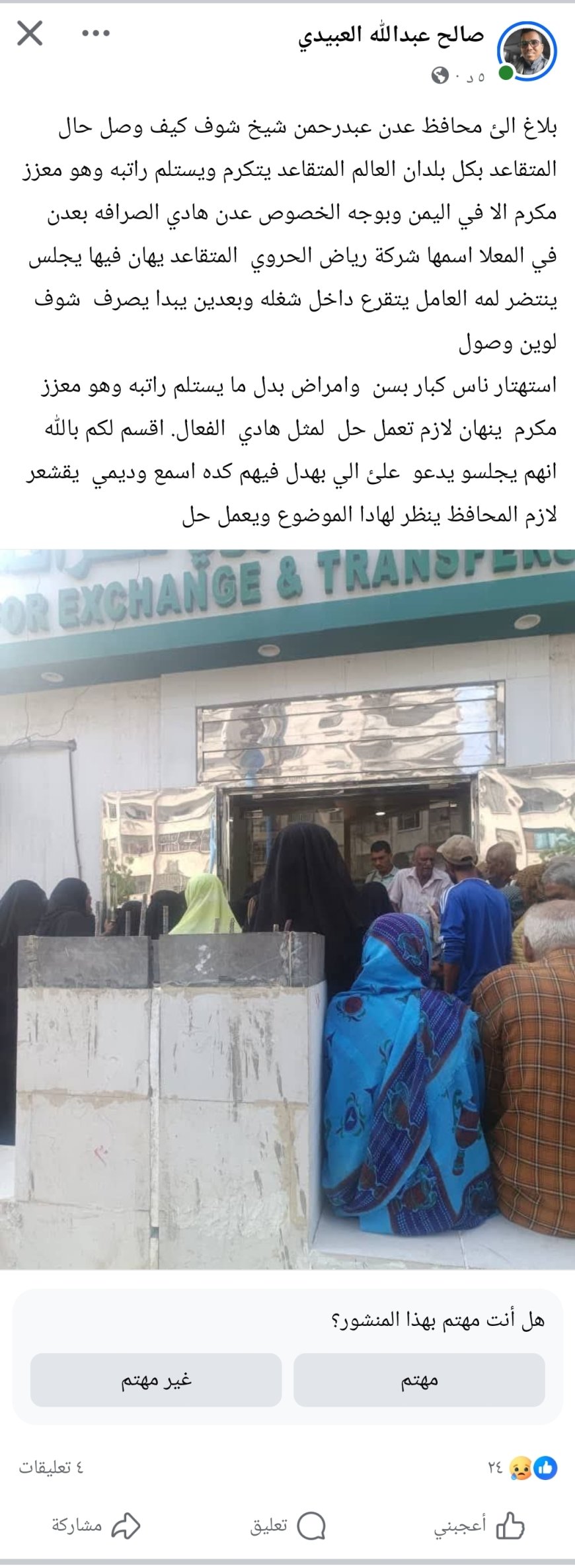 المصور الحربي صالح العبيدي:يناشد وزير الدولة محافظ العاصمة عدن لوقف إهانة متقاعدي عدن من قبل شركة رياض الحروي للصرافة والتحويلات