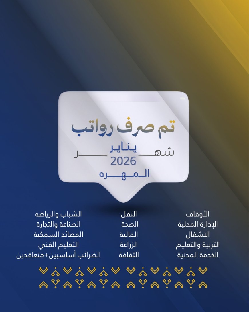 قال بنك حضرموت إنه سيتم البدء بصرف رواتب شهر يناير 2026 لموظفي عدد من القطاعات الحكومية في حضرموت الوادي ومحافظة المهرة، وذلك في إطار الجهود المبذولة لتسهيل حصول الموظفين على مستحقاتهم المالية في مواعيدها المحددة.