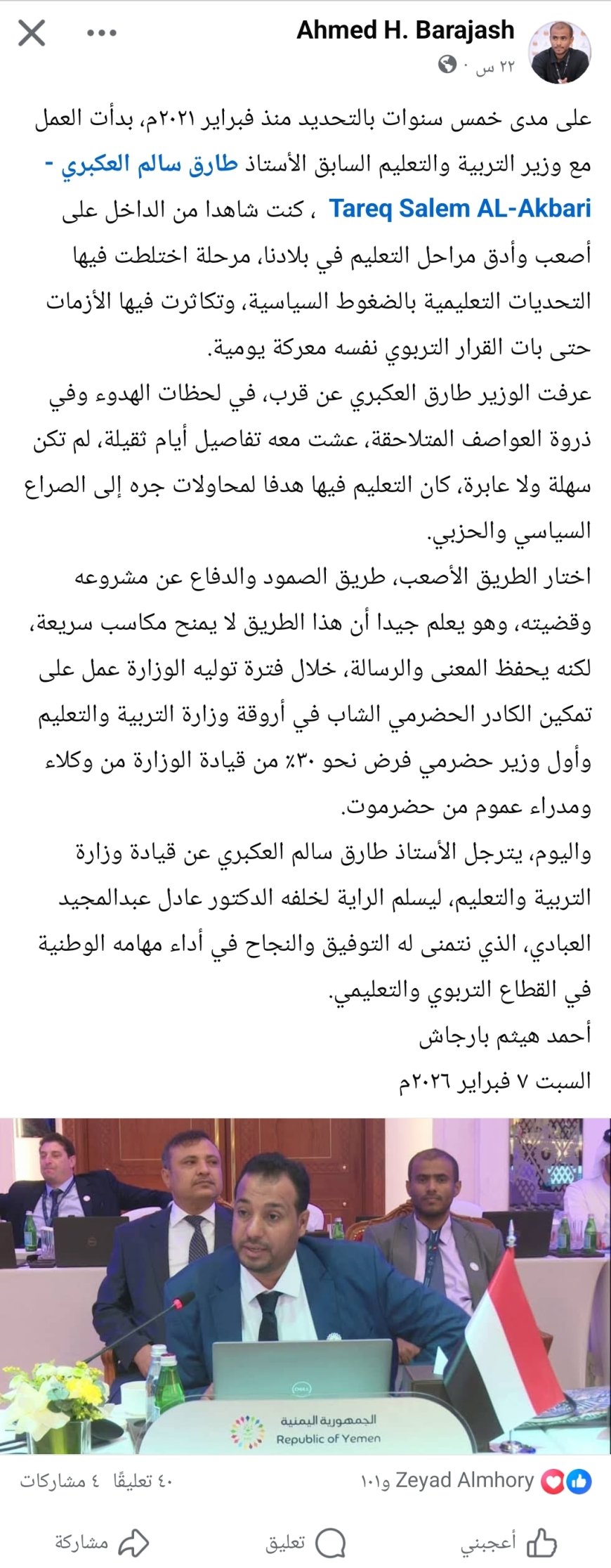 قال الصحفي أحمد هيثم بارجاش، في منشور على حائطه الرسمي بموقع فيسبوك، تابعه ورصده محرر موقع منبر الأخبار، إنه عمل على مدى خمس سنوات متواصلة منذ فبراير 2021م إلى جانب وزير التربية والتعليم السابق الأستاذ طارق سالم العكبري، مشيرًا إلى أنه كان شاهدًا من الداخل على واحدة من أصعب وأدق المراحل التي مر بها قطاع التعليم في البلاد.