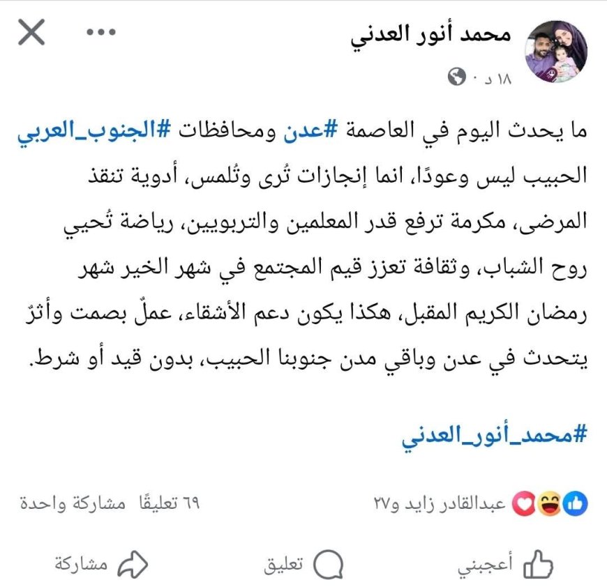 أشاد الناشط المعروف محمد أنور العدني، الذي كان يتولى قيادة منصة ساحة العروض خلال اعتصامات مواليين المجلس الانتقالي الجنوبي، بالدعم المقدم من الأشقاء والذي وصفه بأنه إنجازات تُرى وتُلمس في العاصمة عدن والمحافظات الجنوبية، وليس مجرد وعود.