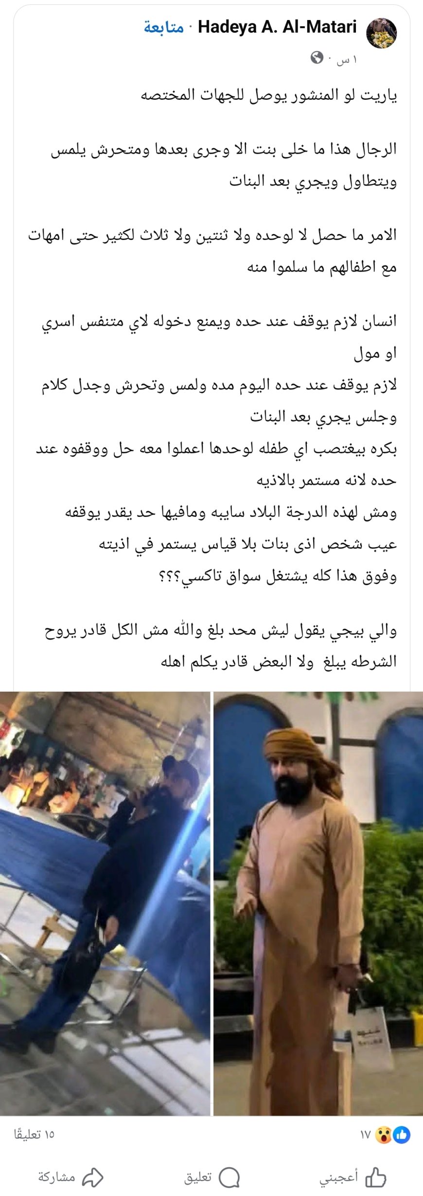 وأكدت النساء أن استمرار هذه التصرفات دون ردع يمثل خطرًا حقيقيًا، مطالبات باتخاذ إجراءات فورية، من بينها منع الشخص المشتبه به من دخول المتنفسات الأسرية والمجمعات التجارية، والتحقيق في الشكاوى المنسوبة إليه، خاصة في ظل الحديث عن ممارسته العمل كسائق أجرة، الأمر الذي يزيد من المخاوف المرتبطة بسلامة النساء والفتيات.