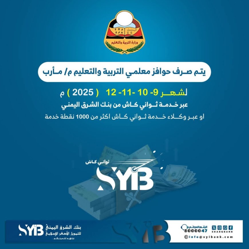 أعلن بنك الشرق اليمني للتمويل الأصغر الإسلامي عن بدء صرف حوافز الأشهر (9 – 10 – 11 – 12) لعام 2025م لمعلمي ومعلمات التربية والتعليم في محافظة مأرب، وذلك عبر خدمة "ثواني كاش" التابعة للبنك.