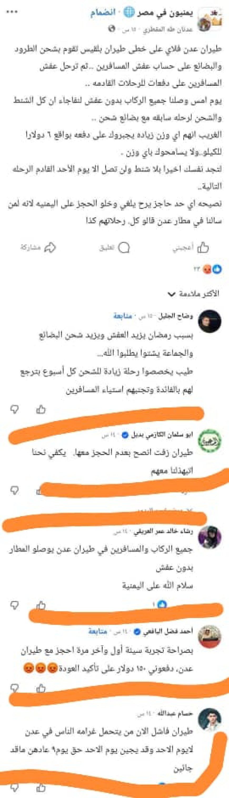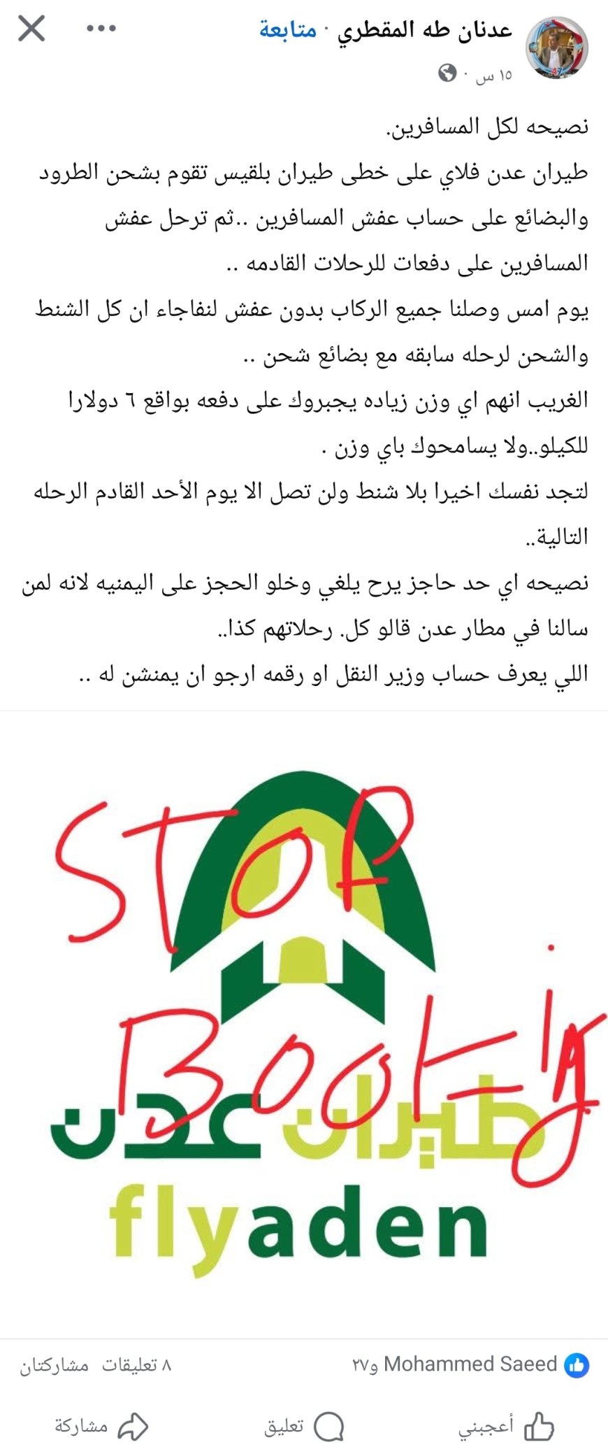 رصد محرر موقع منبر الأخبار منشوراً للناشط عدنان طه المقطري على صفحته في موقع التواصل الاجتماعي “فيسبوك”، وجّه فيه تحذيراً للمسافرين بشأن ما وصفه بتكرار ترحيل أمتعة الركاب على متن طيران “عدن فلاي”، مقابل شحن طرود وبضائع على نفس الرحلات.