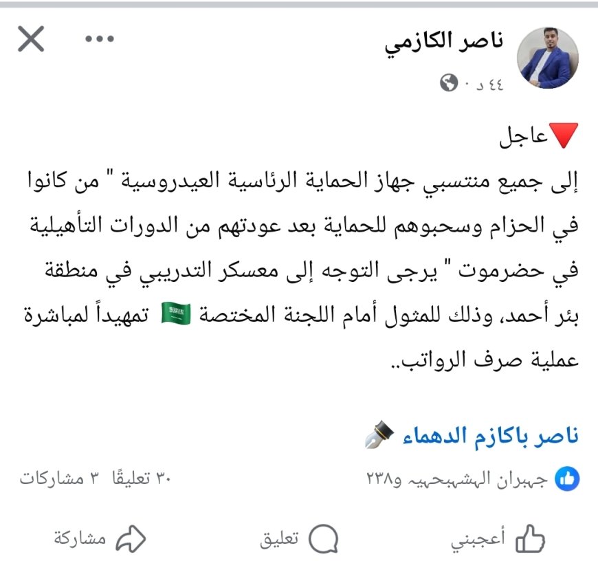عاجل: توجيه رسمي لمنتسبي الحماية الرئاسية التابعة لعيدروس الزُبيدي بسرعة التوجه إلى معسكر بئر أحمد لمقابلة اللجنة الخاصة